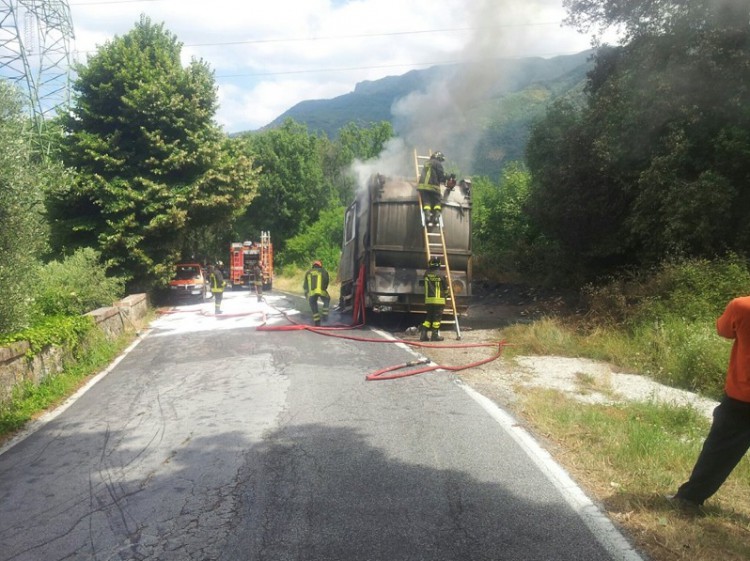 Sul posto vigili del fuoco, personale della Provincia per la bonifica della strada che è rimasta chiusa per consentire le operazioni di spegnimento, E la polizia municipale,. Da stabilire se l’incendio è stato causato da iun corto circuito o da qualcosa che era nel carico.