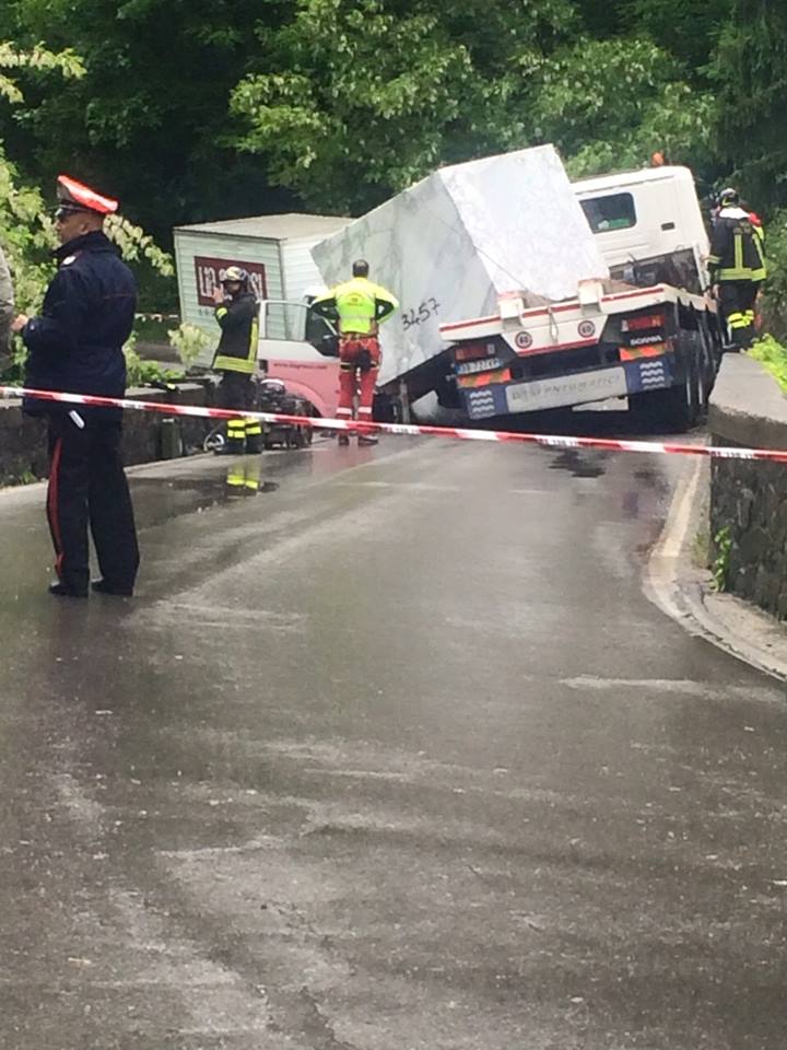 CASTELNUOVO - Grave incidente stradale sulla via per Arni, poco dopo Torrite, dove un blocco di marmo caricato su un camion è caduto sull'abitacolo di un furgone.