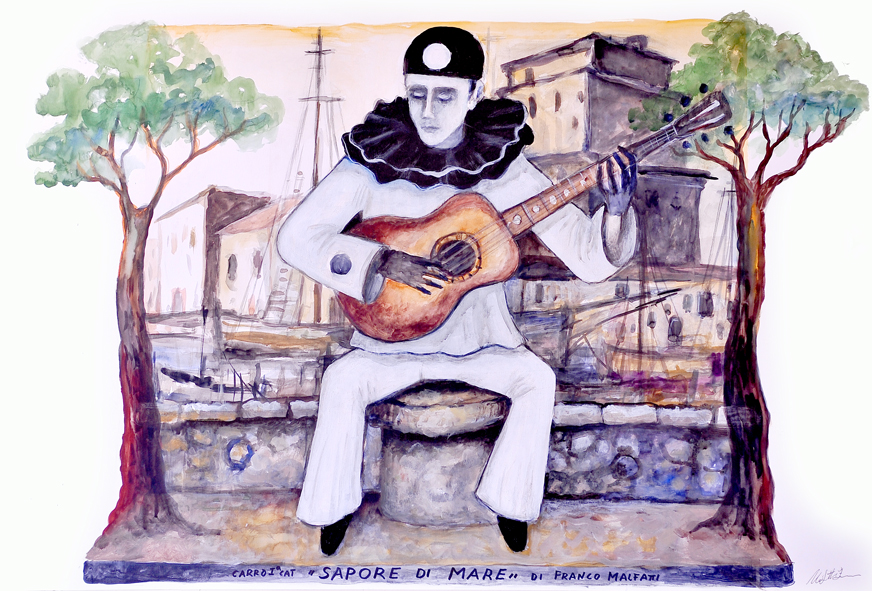“In te son nato” di Franco Malfatti è un quadro di Viareggio con un triste Pierrot che però vuole scuotere le coscienze dei viareggini.