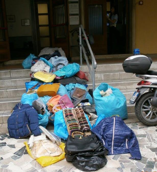 Borse e pochette di Prada, Luis Vuitton,Chanel, Valentino, Tod’s, Hermes, Alviero Martini, piumini Colmar, Napapijri, Woolrich, occhiali Ray-Ban, cappelli all’ultima moda stile rapper ma anche maglieLacoste, foulard di Gucci e Fendi, cinture Dolce & Gabbana: in tutto oltre 340 articoli, 203 dei quali con impresso il marchio contraffatto delle più importanti case di moda.