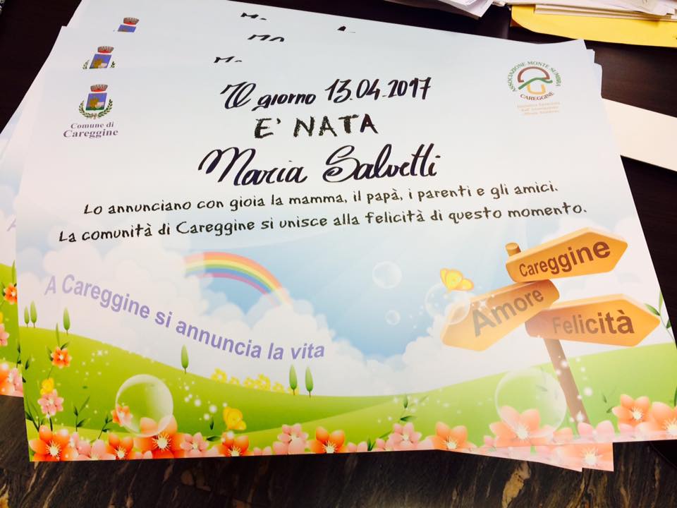 “La nascita di una bambina o di un bambino è di per se un evento meraviglioso – ha spiegato il sindaco -. Se poi la gioia “colpisce” una piccola comunità l’evento assume un valore molto speciale. È segnale tangibile di speranza per tutti coloro che vi abitano e lottano quotidianamente per il suo futuro.  Per questo a #Careggine abbiamo deciso di festeggiare il lieto evento dando il benvenuto ad ogni nuovo nato attraverso veri e propri “Annunci di Vita” affissi in tutte le bacheche del comune. Un modo unico per condividere assieme un momento felice e davvero speciale”. L’onore del primo cartello è spettato a Maria Salvetti.