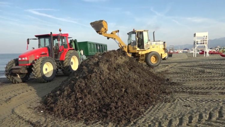 Sei mezzi in funzione tra trattori, ruspe e pale, a cui si aggiungono i due camion di Ersu che hanno fatto la spola tra la spiaggia e l’impianto di trattamento del materiale rimosso al Portone. 100 tonnellate asportate dal bagnasciuga, che fanno salire il monte complessivo a 1.400 tonnellate di alghe smaltite da inizio stagione. Le operazioni – coordinate dal Comune di Pietrasanta e dal Consorzio dei balneari – si sono concluse poco dopo le otto di mattina, con il via libera del vicesindaco Daniele Mazzoni, arrivato di buonora sulla spiaggia libera di Montrone per monitorare la situazione, insieme al presidente dei balneari, Francesco Verona.