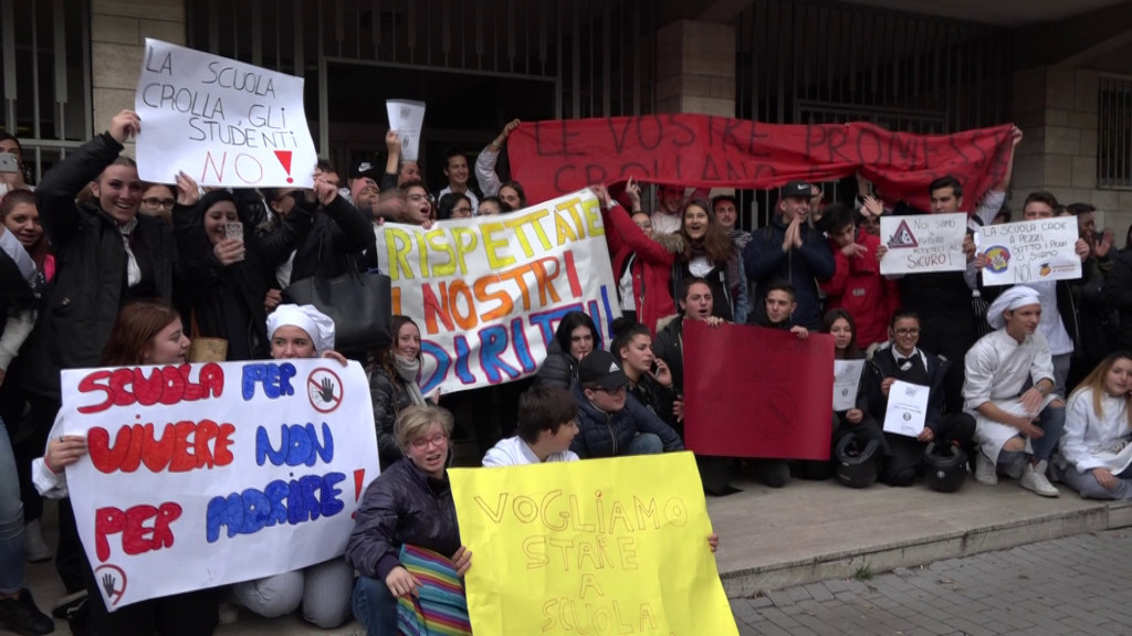 Tra cori e striscioni tanti studenti con l’uniforme da cuoco e da camerieri, pronti a servire i loro finger food cucinati per l’occasione. Una protesta molto vivace, per chiedere nuovi spazi per aule, laboratori e cucine in attesa che partano a febbraio i lavori annunciati dalla Provincia, ente competente in materia.