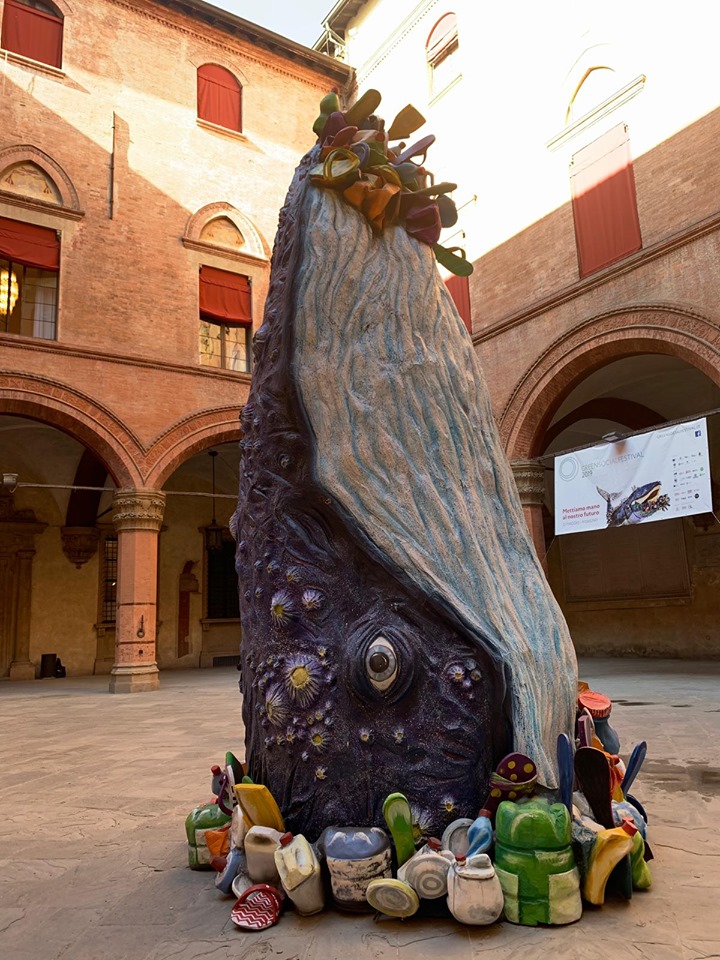 L’ormai celebre costruzione, che ha già fatto il giro del mondo con milioni di visualizzazioni, rappresenta una balena morente soffocata dai rifiuti. La balena è esposta nel cortile del Comune durante la fase conclusiva della decima edizione del Green social festival, “dedicato quest’anno all’Agenda 2030 dell’Onu – scrive Palazzo D’Accursio – con appuntamenti fino a giugno per sensibilizzare, generare dibattito, mettere in scena le buone pratiche della sostenibilita’”.