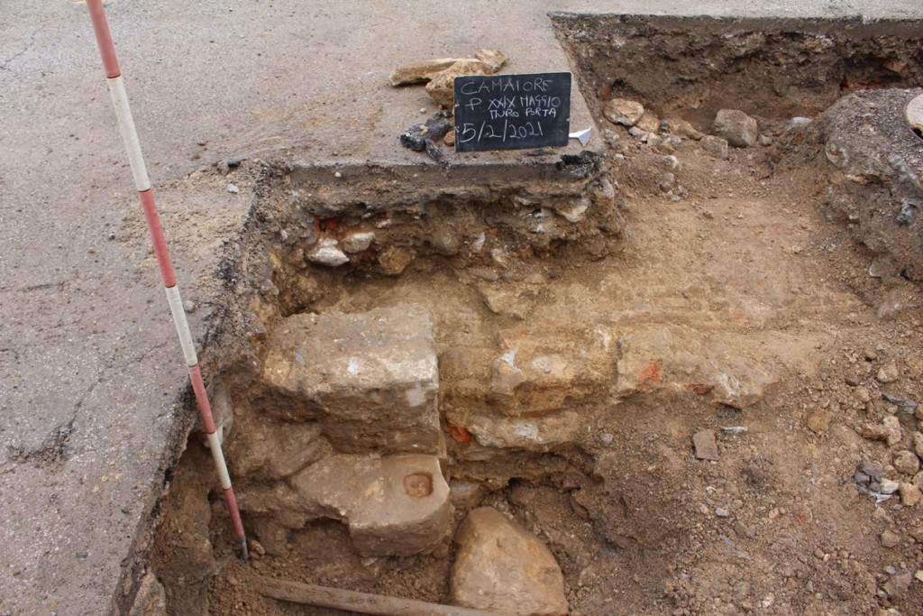 In particolare all’incrocio con viale Oberdan è stata rinvenuta una piccola parte del bastione angolare della cinta muraria e un tratto delle mura che proseguivano lungo il viale. Al centro della piazza, in corrispondenza di via Vittorio Emanuele, è stato poi messo in luce ciò che rimane del basamento in marmo della Porta Genovese, antico ingresso della città, a fianco dell’antica chiavica a volta realizzata in mattoncini. Durante i lavori sono, inoltre, stati recuperati frammenti di ceramiche post-medievali e moderne (dal ‘400 al ‘700 circa) e alcuni materiali in metallo: i reperti sono stati portati al Civico Museo Archeologico di Camaiore per la pulizia e lo studio.