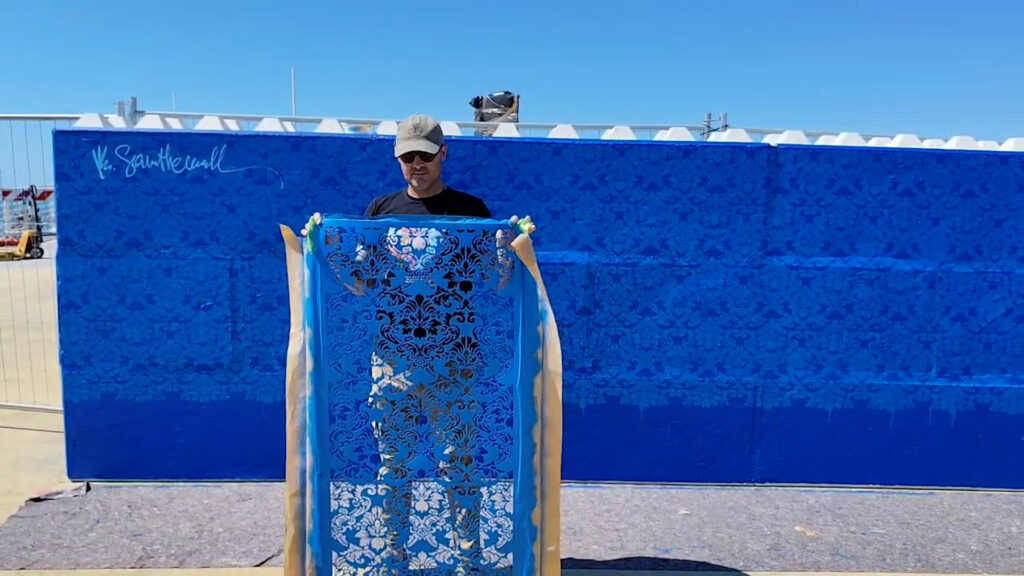 Proprio a Massa, l’artista ha deciso di rompere la sua regola e dipinge per la prima volta su un muro vero: una lunga parete di cantiere affacciata sul mare, davanti al pontile. L’opera è ufficialmente iniziata e sarà completata entro il 20 agosto. Il progetto prevede venti interventi site-specific dal forte impatto visivo e simbolico, tra cui le sue celebri rane antropomorfe che trascinano via la nave Guang Rong come fosse un relitto da lasciarsi alle spalle.